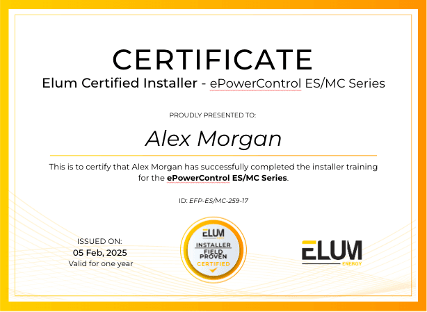 - The Field-Proven Installer Certificate is reserved for professionals who have successfully completed at least one Elum Energy installation.