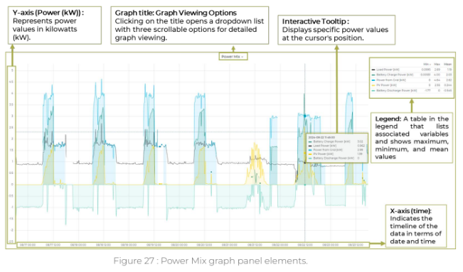 - Battery Overview: A graph that visualizes curves for the battery’s state of charge (M), battery discharge power (kW), and battery charge power (kW).