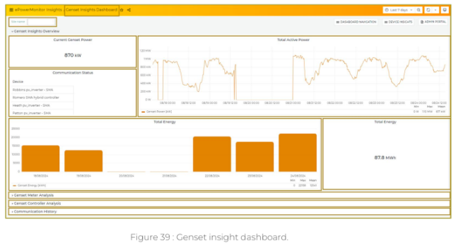 - Genset Controller Analysis: A set of graphs displaying various parameters related to the genset controllers, including “Genset controller status”, “Active power per meter”, “Active power per phase”, “Reactive power per phase”, “Current per phase”, “Voltage per phase”, “Frequency per phase” and “Power factor per phase”