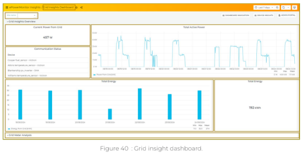 - Grid meter analysis: A set of graphs providing detailed metrics from the grid meters, including: