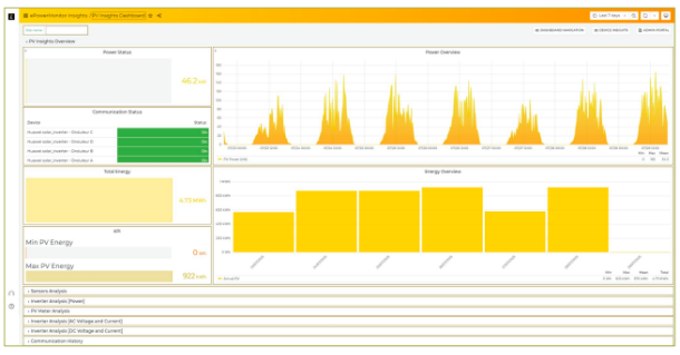 - Total Energy: Displays the cumulative energy produced since commissioning, highlighting both actual PV generation and potential PV yield for performance tracking.