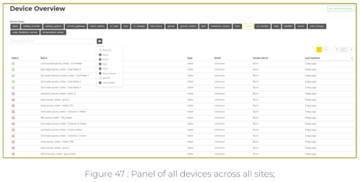 Clicking on the “Devices” section in the top bar allows you to view devices across all sites you have access to and provides comprehensive information about devices in all assigned locations. If you manage multiple sites, the global devices view lets you select which columns to display, such as Device ID, Status, Name, Type, Serial, Vendor Name, Asset ID, and Last Update.
