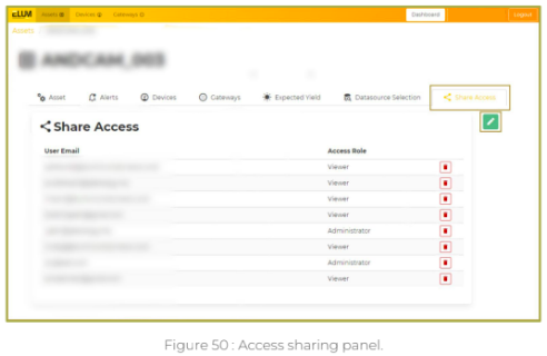 The “Share access” tab allows you to control user access to the platform. You can add new access by entering user details and assigning access levels, and delete access by removing users from the system.