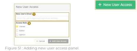 Click on “Admin Portal” in the top right corner of the main display area > Select “Share Access” > Click on the pencil icon “Edit” > Click on “+ New User Access”